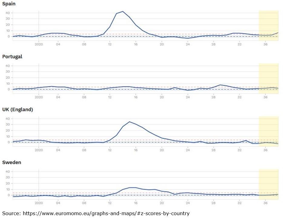 Darüber hinaus fand der allergrößte Teil Übersterblichkeit in diesen Ländern nur während eines sehr kurzen Zeitraums statt, nämlich innerhalb von etwa zwei bis drei Wochen im April. Wie die Euromomo-Todesratenstatistik zeigt, waren die Kurvenverläufe auch in diesen Ländern bis etwa Ende März relativ „langweilig“ gewesen, doch dann schoss die Übersterblichkeit plötzlich in die Höhe, um dann gegen Mitte April wieder drastisch abzufallen, was sich in einem deutlich erkennbaren Zacken in den Grafiken der Belgien, Frankreich, Italien, Spanien und dem Vereinigten Königreich sichtbar macht (siehe unten eingefügte Charts):