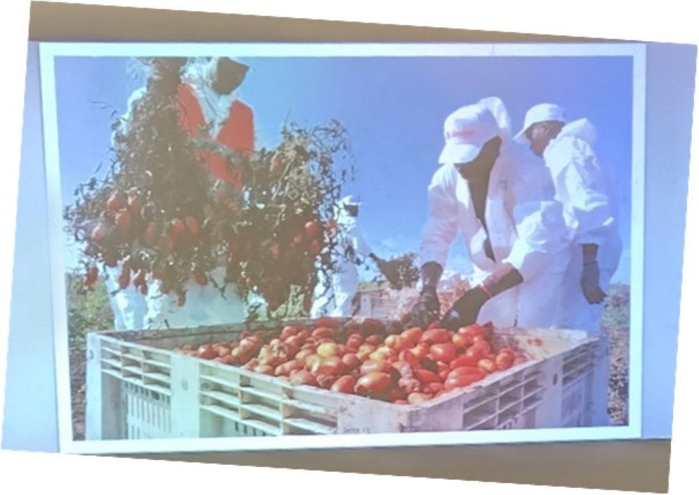„Warum kosten Tomaten aus Süditalien, vor allem Tomatenkonserven, trotz längerer Transportwege nur ein Bruchteil von hiesigen Tomaten? Weil die Erntehelfer in Süditalien für ihre Tagesarbeit, die in rund 1200 Kilo geernteter Tomaten besteht, maximal vier Euro Tageslohn erhalten.“