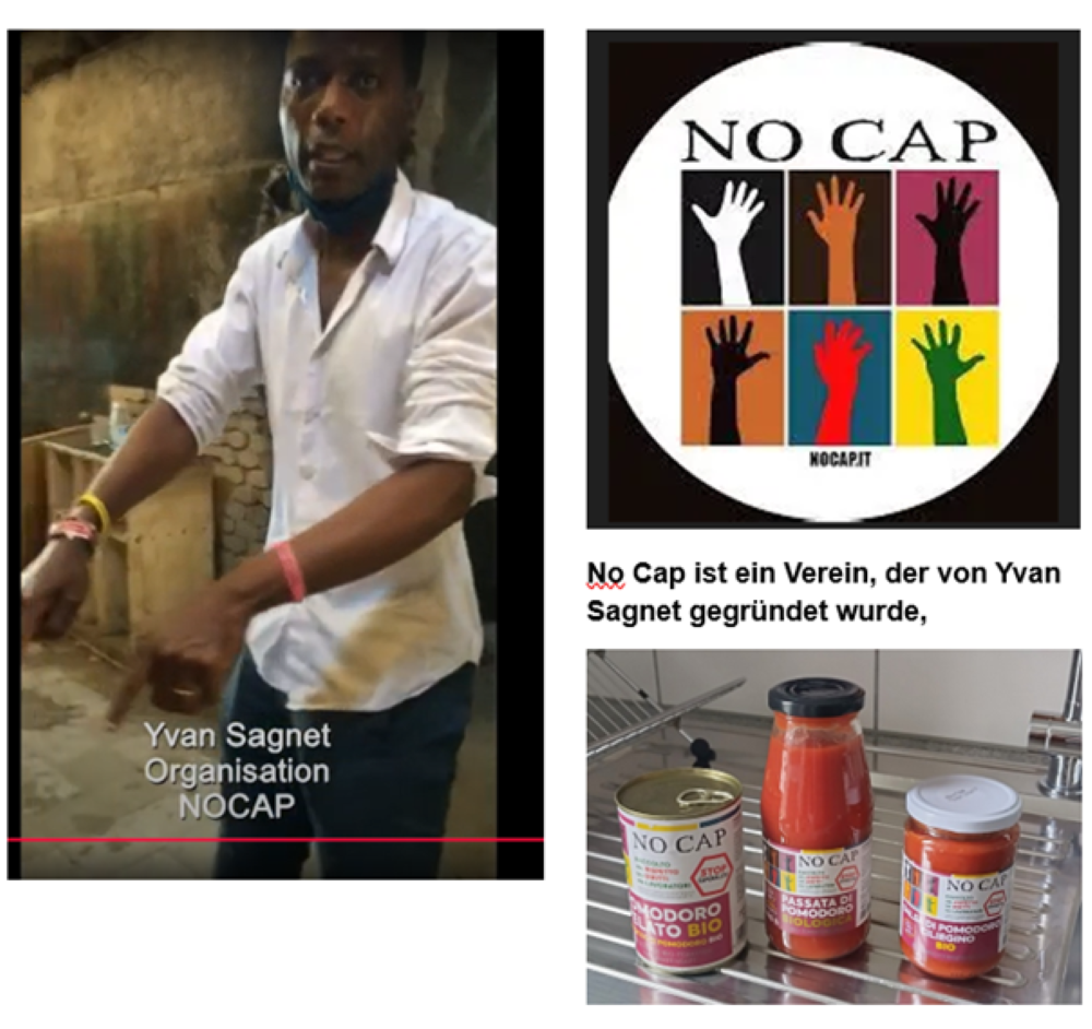 „No Cap ist ein Verein, der von Yvan Sagnet gegründet wurde. Er bietet faire Arbeitsbedingungen für Migranten an. Unter dem Namen No Cap werden denn auch Konserven aus fair und biologisch produzierten Tomaten hergestellt. Die Produkte werden ohne Ausbeutung von migrantischen Landarbeitern in Italien hergestellt. Dies geschieht im Rahmen eines Projekts, das sich gegen das Caporalato-System wendet, ein System, das Migranten in der Landwirtschaft ausbeutet. Das Netzwerk No Cap kooperiert mit Bauern, die menschenwürdige Arbeitsbedingungen garantieren und die nach strengen Kontrollen die Zertifizierung von No Cap erhalten haben. Ihre Plantagen sind dem Einfluss der Mafia entzogen worden. In Deutschland sind auch Orangen, Zitronen, Melonen, Trauben, Erdbeeren und weitere Früchte mit dem No-Cap Label erhältlich.“