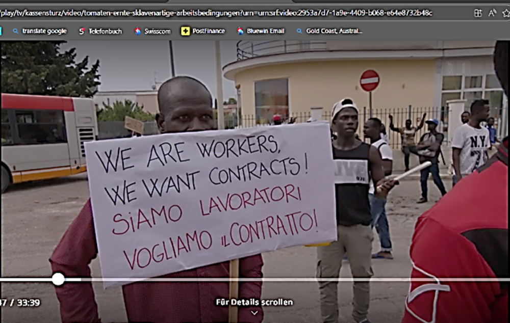 Afrikanische Erntehelfer demonstrierten in Süditalien für mehr Rechte. Sie berichteten von harter Arbeit unter unmenschlichen Bedingungen, wie ein Bericht der Sendung Kassensturz zeigte, „Die Tomatenernte ist die schwierigste und schlimmste Arbeit auf den Feldern Italiens“, sagt ein Arbeiter. Andere streckten ihre geschundenen Hände in die Kamera: „Das ist von der Tomatenernte!“